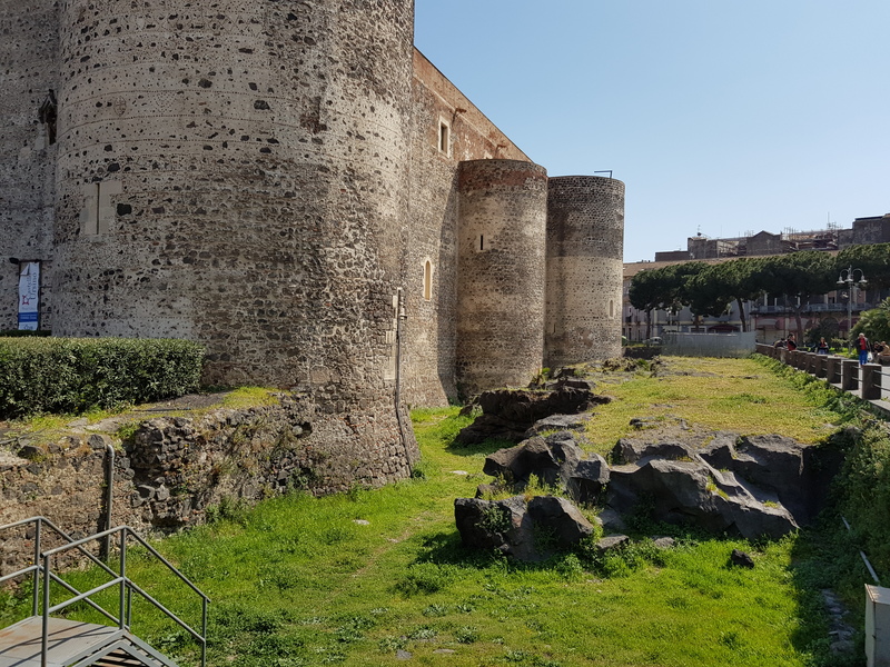 Este castelo é o único edifício medieval que sobreviveu à destruição da cidade por natureza. Em outras palavras, sobreviveu aos terremotos e erupções do Etna. E ainda hoje está incrivelmente quase intacto. O forte foi construído por volta de 1240 para defender a cidade dos ataques vindos do mar. Sim, você leu certo! Originalmente, ele foi construído em um penhasco com vista para o mar. Apesar de ser realmente difícil imaginar, isto aconteceu de fato. Atualmente, o forte está a cerca de 1 km para o interior, mas ele era um forte às margens do Mediterrâneo.