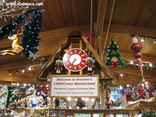 Os números desta loja são impressionantes e americano adooooora isto. Tudo é grandioso e a fachada da loja lembra um chalé alpino. Do lado de fora da loja estão, ao ar livre, três Papais Noéis e um Boneco de Neve de 5 metros de altura cada. Cerca de 100.000 luzes iluminam os 800 metros da rua Bronner’s Christmas Lane à noite. E no interior da loja existem cerca de 800 figuras animadas e iluminadas espalhadas por toda sua extensão. Diz-se que a conta de luz da loja é de US$1,250 por dia!
