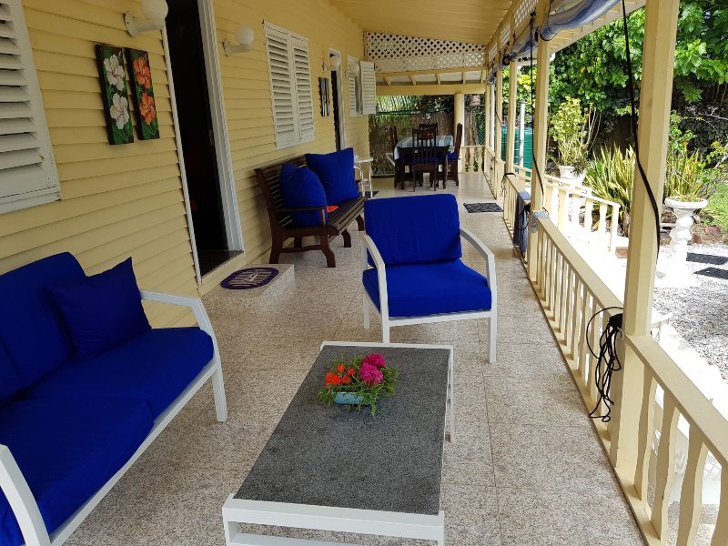 Já em Anse Kerlan, a casa que escolhemos era bem confortável, a Sunset Cove Villa. O lugar tinha um jardim bonito e que dava direto na praia. A casa tinha 3 quartos e 2 banheiros, além de uma sala e cozinha boas. A varanda era enorme e uma delícia. No jardim tinha alguns coqueiros carregados, que forneceram cocos fresco e água de coco todos os dias para nós. Além de ter um pôr do sol de sonhos!