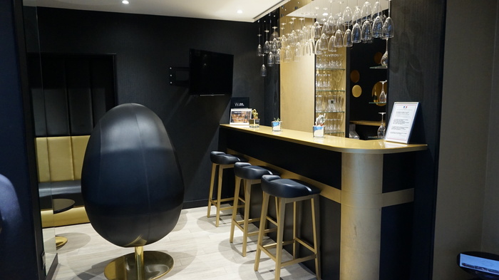 As paredes do bar contam com nichos onde estão garrafas de Champagne com nome do hotel. Para combinar, no ambiente estão belas poltronas em formato de ovo, mesinhas que imitam rolhas de Champagne e até uma estante com vários livros sobre o grande tema do hotel: o Champagne.