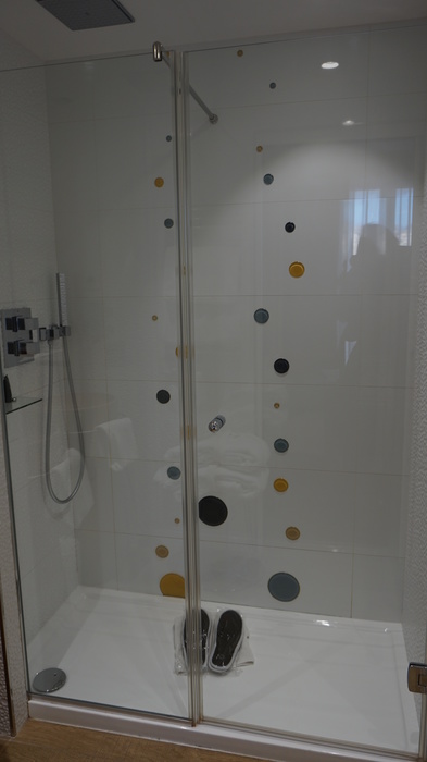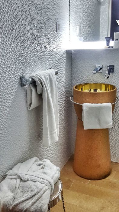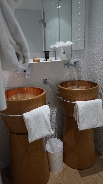 O banheiro é uma graça! As pias simulam rolhas de Champagne, assim como algumas banquetas que ficam nos quartos. Tudo muito limpo e de muito bom gosto. Conta com banheira e ducha separada num ambiente, e o vaso sanitário fica separado, num outro espaço.