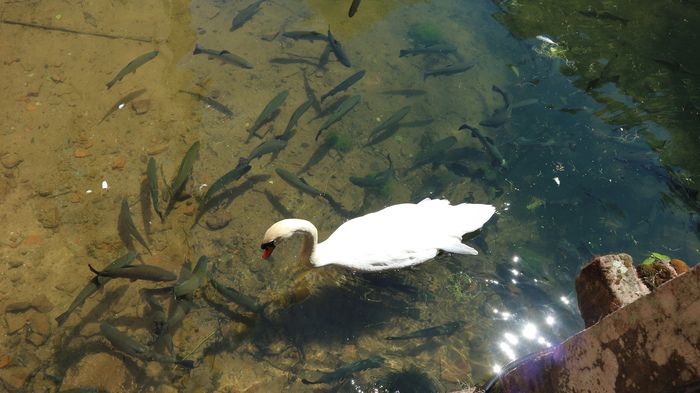 Rodeado pelo lago, a vista é impressiva e muito fotogênica. No lago tem patos e cisnes nadando, assim como inúmeros peixes, que podem ser alimentados. Aliás, você pode comprar um saquinho de comida para os peixes que eles vendem por 0,20 centavos. Os peixes se amontoam para serem alimentados.