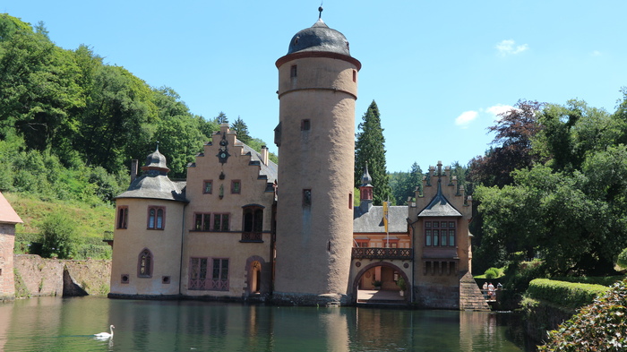 Os apaixonados por castelos alemães e com mais um pouco de tempo em Frankfurt, não devem perder de conhecer o lindo Schloss Mespelbrunn. Este é daqueles castelos que fica em cenário de sonho, rodeado por um lago e que conta até com cisne nadando ao seu redor!