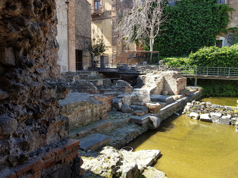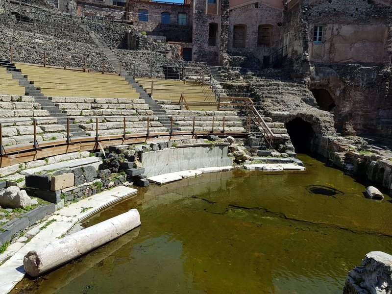 Em frente ao palco, chamado de cena, passava um braço artificial do Rio Amenano. Isto porque na época romana, as águas deste rio eram transportadas para o teatro para permitir shows com jogos de água. Além disso, servia para mover as engrenagens mecânicas dos conjuntos (!!!). Imaginem que espetáculo! Este rio foi coberto pela erupção de 1669 e que destruiu quase toda cidade, e que desde então ele flui subterraneamente.