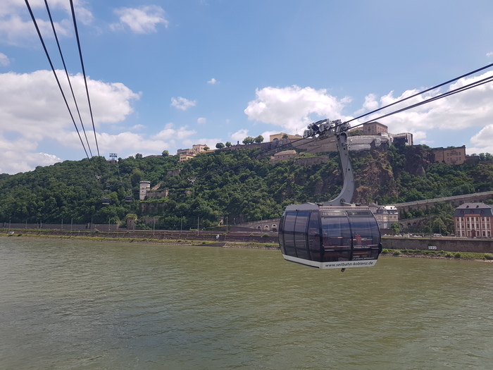 O teleférico liga o Deutsches Eck a Fortaleza Ehrenbreitstein, passando sobre o Rio Reno. Este é um passeio incrível porque das cabines do teleférico se avista ainda Koblenz, o Rio Mosel e toda a região. Sem dúvida, uma vista muito especial!