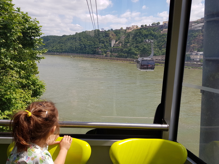 Um dos passeios mais legais, para adultos e crianças que visitam o Deutsches Eck é pegar o teleférico que sai das margens do Rio Reno e o atravessa, seguindo até o alto do monte Ehrenbreitstein, do outro lado do rio, onde está a Fortaleza Ehrenbreitstein. Sem dúvida, este é uma daquelas experiências que a gente não esquece tão fácil!